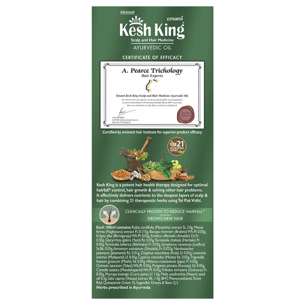 Kesh King Ayurvedic oil is a proprietary medicinal preparation without any side effects. It is a complete solution for Hair related problems especially Hair fall control and hair growth. It has been made from 21 Ayurvedic herbs as per text prescribed in Ayurveda and Tel Pak Vidhi. It effectively delivers nutrients into the deepest layer of scalp & hair with the help of the revolutionary Deep Root Comb.