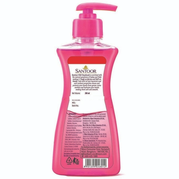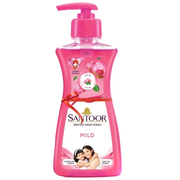 Santoor mild handwash is enriched with the natural goodness of lotus and tulsi that offers unique dual benefit of tough on germs and soft on hands.