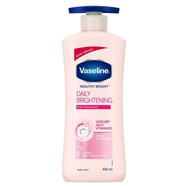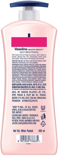 Having healthy, glowing skin is a vital part of your overall health. Are you only taking care of your face and neglecting the other 95% of your skin? Vaseline® believes that truly healthy skin starts with deep healing moisture. It’s not something you get by masking problems or through quick fixes.Your body produces melanin in response to the pollutants, and UV exposure which can lead to skin damage, darkening and uneven skin tone. Vaseline® Healthy White, our best skin lightening lotion helps heal* dry damaged skin and that restores for visibly fairer skin in 2 weeks. With micro-droplets of Vaseline® Jelly, the lotion helps heal* skin. Along with Vitamin B3, that is Known to inhibit the production and transfer of melanin, it brings back skin’s healthy radiance. Triple sunscreens provides fairness protection by blocking UVA and UVB rays to protect your skin's fairness from future damage. Use everyday to help heal* skin and make it look healthier and fairer. The result is a fairness lotion for body that deeply moisturizes to help heal darkened, damaged skin, leaving it healthier and fairer. Healthy, visibly fairer skin in 2 weeks. BEST FOR : DAILY FAIRNESS, UNEVEN TONE, DRY AND DAMAGED SKIN, DULL SKIN
