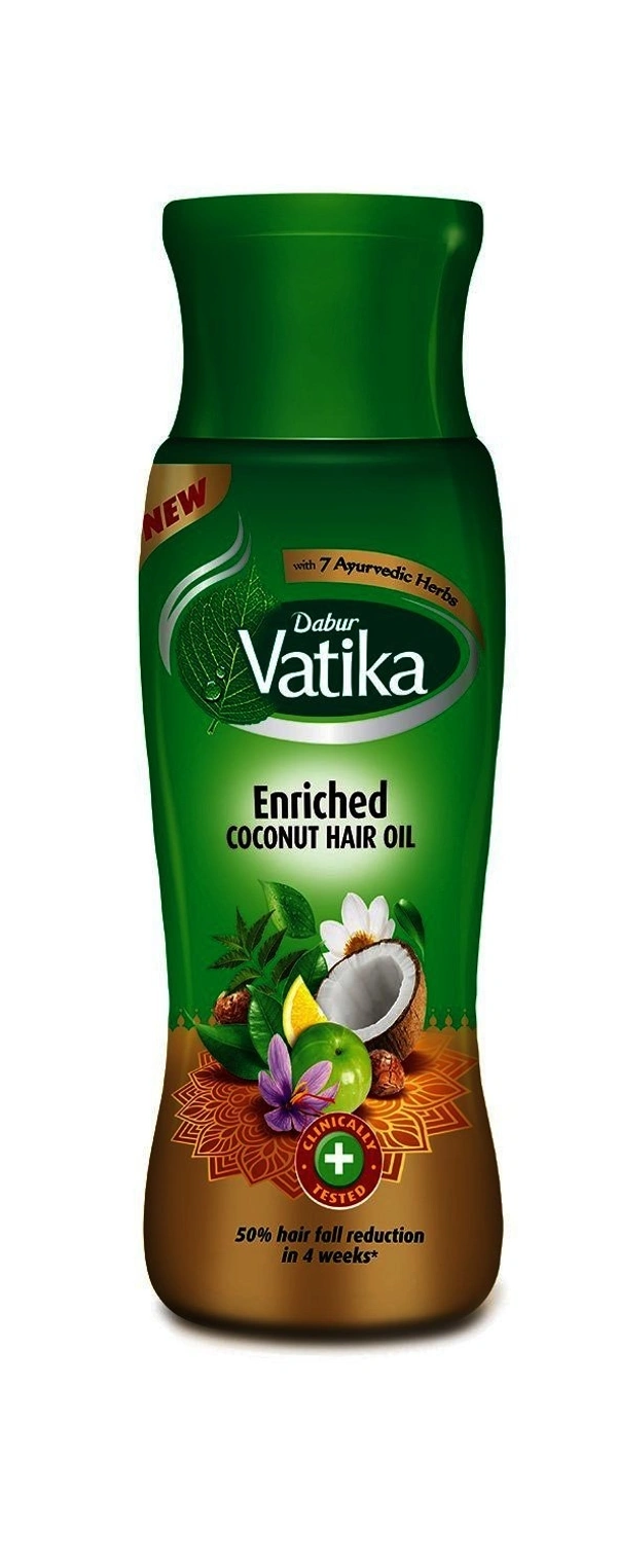 - New Vatika Enriched Coconut Hair Oil with 7 ayurvedic herbs is clinically proven to reduce hairfall by 50% in 4 weeks