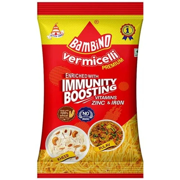 Rich in calcium, wheat and protein Bambino Vermicelli is a ready to use product that can be cooked in various ways. Prepare a creamy sweet kheer with milk and delicious dry fruits or a savoury upma or vegetable pulao using freshly cut vegetables, traditional Indian spices and roasted aromats. Bambino Vermicelli is made using a special process that ensures it is non-sticky and does not form lumps when cooking. Have it as a healthy evening snack or a mid-morning breakfast, either way Bambino Vermicelli has a mouth-watering flavour and aroma that will make all of your dishes extremely delicious. Easy to cook and tastier to eat, enjoy a generous helping of vermicelli that is ready in very less time.